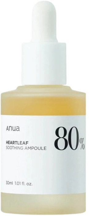 ANUA Heartleaf 80% Soothing Ampoule es una potente ampolla calmante diseñada para hidratar y equilibrar la piel sensible o irritada. Formulada con un 80% de extracto de Heartleaf (Houttuynia Cordata), una planta conocida por sus propiedades antiinflamatorias y antioxidantes, esta ampolla ayuda a reducir el enrojecimiento, calmar la irritación y fortalecer la barrera cutánea.