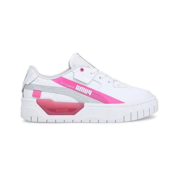 Precioso modelo de sneakers de la mano de Puma, la Zapatilla Cali Dream Tech White, un modelo de piel, con 2 bandas decorativas, una en gris y otra en rosa en el lateral y doble suela de goma.